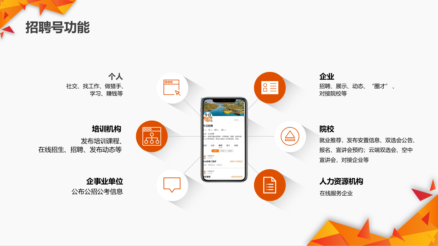 招聘號,是今日招聘用戶服務號,致力于幫助個人、企業(yè)、機構(gòu)、院校和事業(yè)單位在移動端獲得更多曝光和關(guān)注,通過大數(shù)據(jù)分析和智能推薦,在求職中能全面了解企業(yè)信息,讓求職更安心;促進校企合作,讓企業(yè)對接院校更便捷;訂閱公招公考,時時掌握企事業(yè)單位招聘。打造一個良好的社交性招聘生態(tài)平臺,是招聘號發(fā)展的重要的方向。